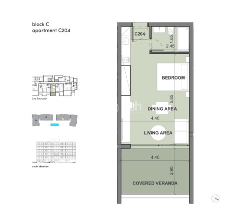 The studio has a covered internal area of 38m2 and a covered veranda of 15m2.