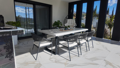 The layout has been carefully planned to create a bright and airy atmosphere. A spacious living area connects effortlessly to a modern open-concept kitchen, fully fitted with premium appliances and complemented by an elegant dining space. There is also a separate fully equipped secondary kitchen/utility room, along with a guest WC for added practicality.