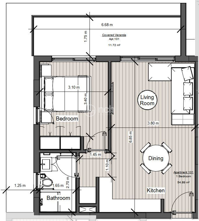 For sale is a modern off-plan apartment located in the heart of Mesa Geitonia. This beautiful property offers a comfortable internal space of 55 m² and a covered veranda of 12 m², designed with practical layouts for easy living. The apartment features one spacious bedroom and a contemporary bathroom, making it ideal for singles or couples looking for a stylish home.