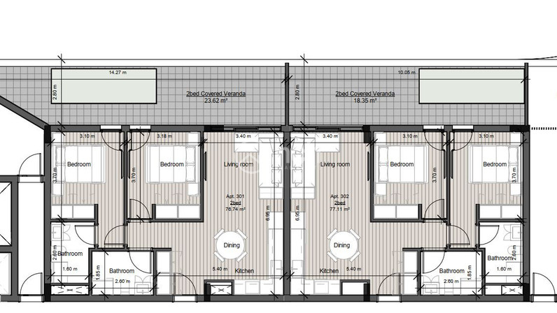 For sale is a modern, off plan apartment in the growing area of Kato Polemidia. Designed for comfortable living, this property offers an internal space of 77 m² and covered veranda of 24 m², and is located on the third floor of a five-story building. The apartment features two spacious bedrooms and two elegant bathrooms, perfect for small families or professionals.