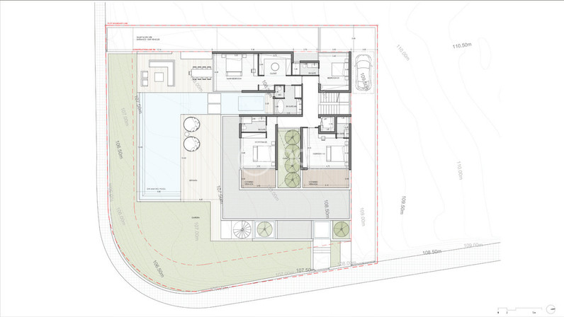 The layout includes six spacious bedrooms and six modern bathrooms, along with an additional utility room and a dedicated office, ensuring both practicality and convenience for modern living, as well as privacy for residents and guests.