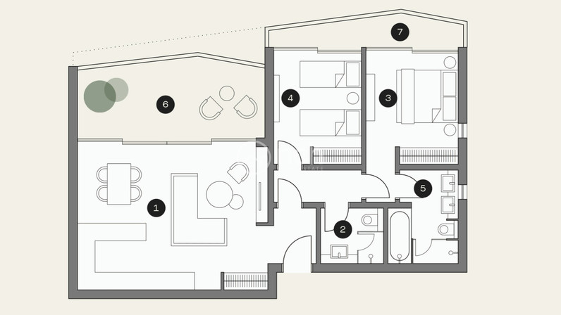 Open-plan kitchen/dining/living opening to a covered terrace. Principal suite with dedicated dressing bathroom and his & hers vanity, plus second bedroom with ensuite and a guest powder room. High ceilings, tall window openings, and seamless indoor-outdoor flow.